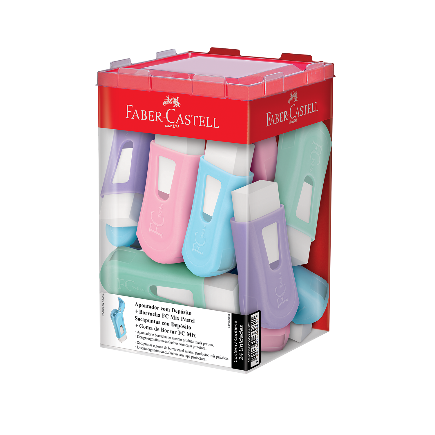 O apontador FC Mix Pastel vem com borracha integrada no mesmo produto para oferecer mais praticidade e conveniência. O FC Mix Pastel conta com um sistema de fechamento que impede a saída de resíduos e uma capa protetora na borracha para evitar a sujeira. Cores suaves e design exclusivo.